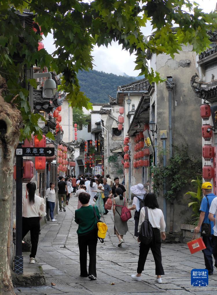 這是游客們在黃山市黟縣宏村內游覽(9月13日攝) 。