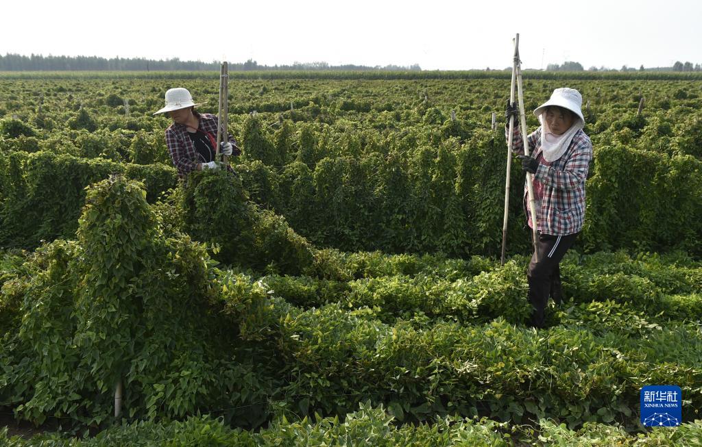 9月15日,河南省焦作市溫縣黃莊鎮米莊村農民在田間整理秧苗,準備收獲鐵棍山藥。