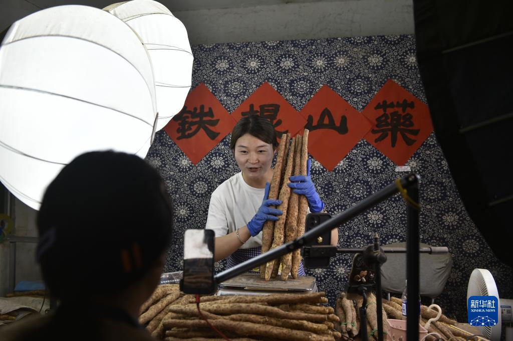 9月15日,河南省焦作市溫縣黃莊鎮東林肇村農民主播通過(guò)網(wǎng)絡(luò )直播銷(xiāo)售鐵棍山藥。