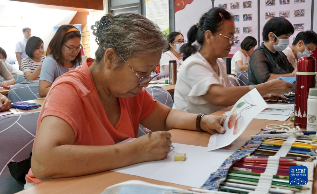 北京市朝陽(yáng)區勁松街道首城社區的居民在社區新時(shí)代文明實(shí)踐所參加彩鉛繪畫(huà)班(9月13日攝)。