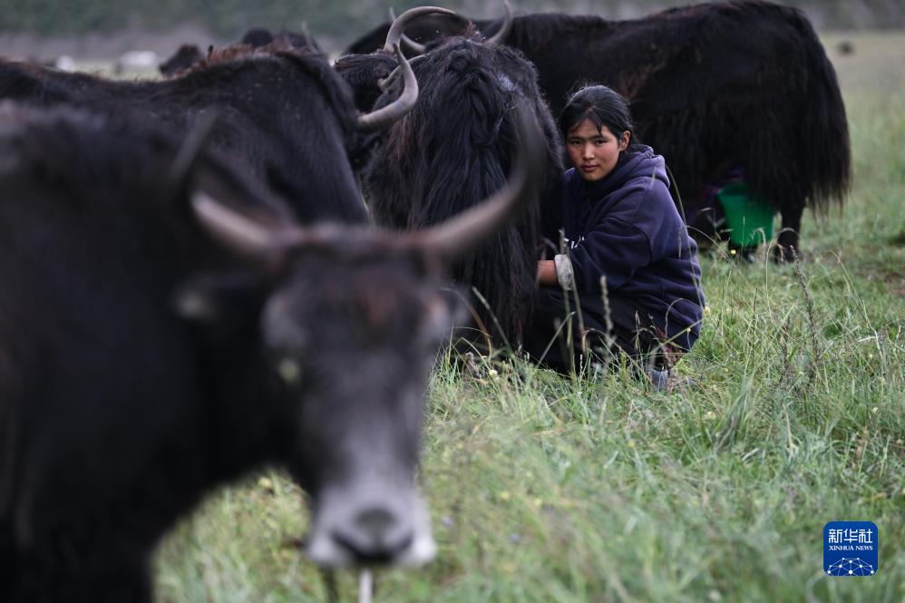 8月17日,在青海省黃南藏族自治州河南蒙古族自治縣多松鄉多松村,扎西曲培的女兒仁青卓瑪在擠牛奶。