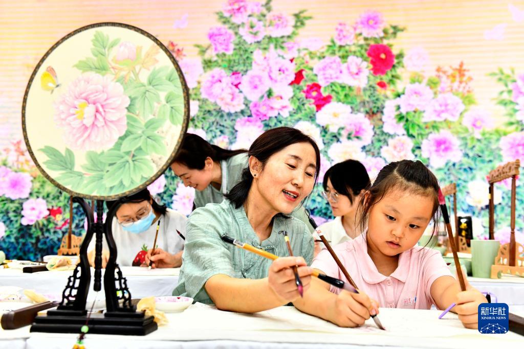 9月16日,在山東國際會(huì )展中心,來(lái)自巨野書(shū)畫(huà)院的藝術(shù)工作者姚愛(ài)紅教孩子給工筆牡丹畫(huà)上色。