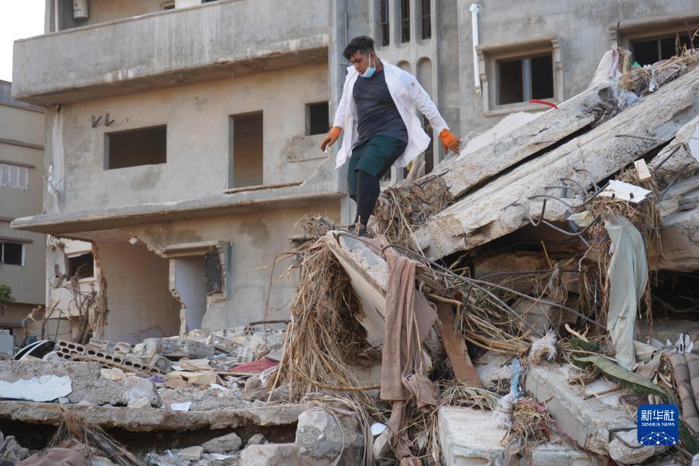 9月16日,救援人員在利比亞德?tīng)柤{的建筑廢墟上工作。