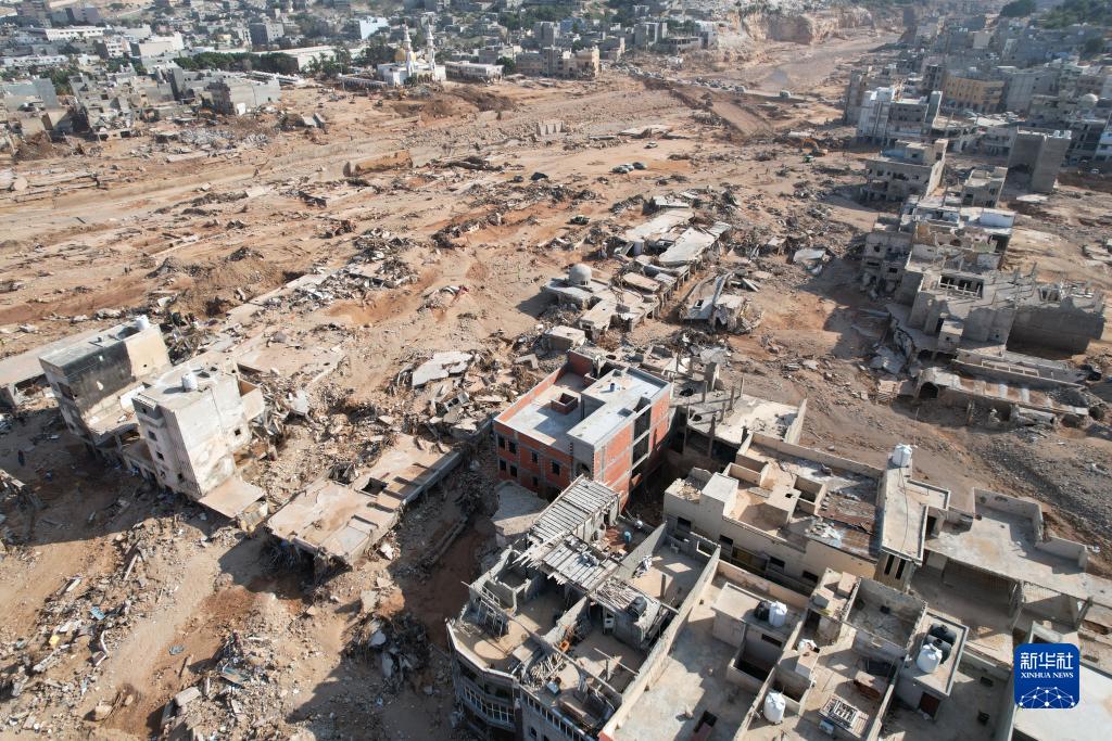 這張9月16日的航拍照片顯示的是利比亞德?tīng)柤{受災地區的景象。