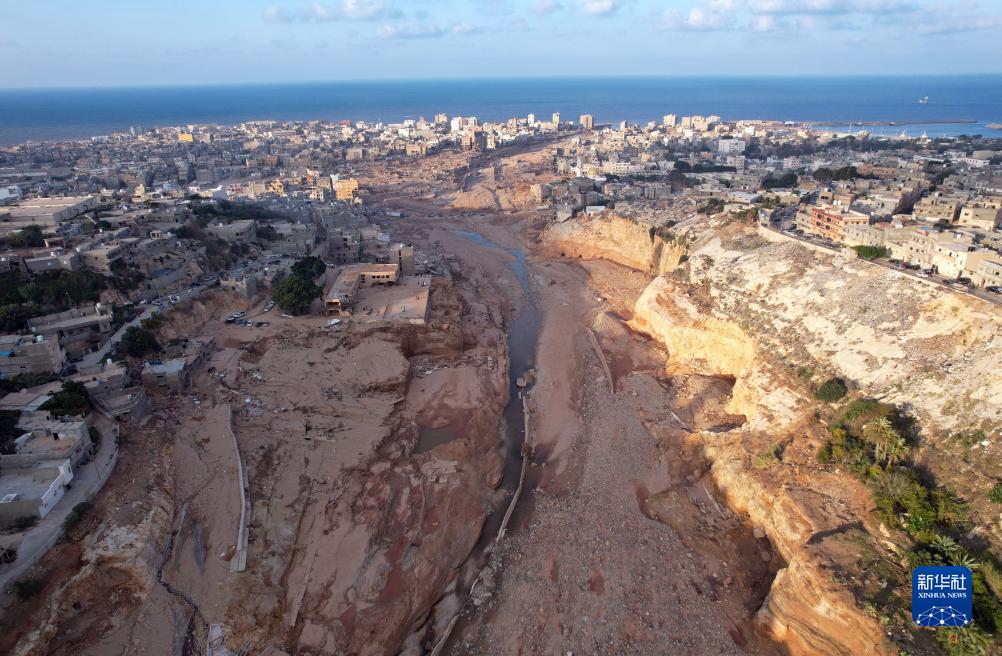 這張9月16日的航拍照片顯示的是利比亞德?tīng)柤{受災地區的景象。