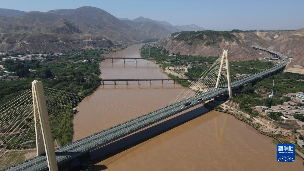 緊鄰甘肅省蘭州市西固區河口古鎮的高速公路大橋橫跨黃河(7月9日攝,無(wú)人機照片)。