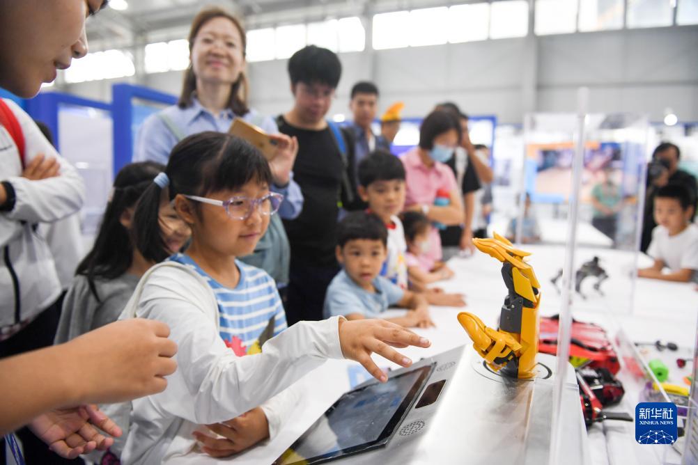 9月17日,在全國科普日北京主場(chǎng)活動(dòng)展區,小朋友體驗與一款機器手進(jìn)行動(dòng)作同步。