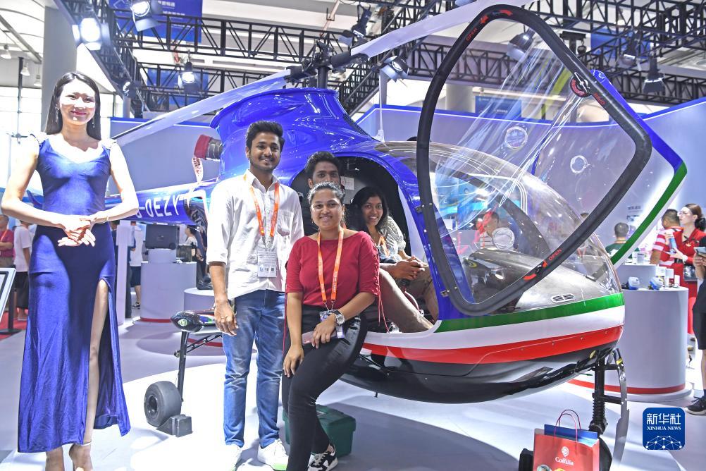 9月17日,在南寧國際會(huì )展中心,觀(guān)眾在東博會(huì )先進(jìn)技術(shù)展區體驗直升飛機。