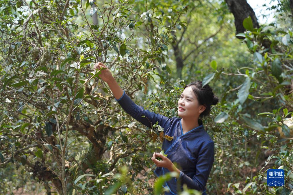 4月19日,當地村民在景邁大寨古茶林采摘春茶。新華社發(fā)(盧磊 攝)
