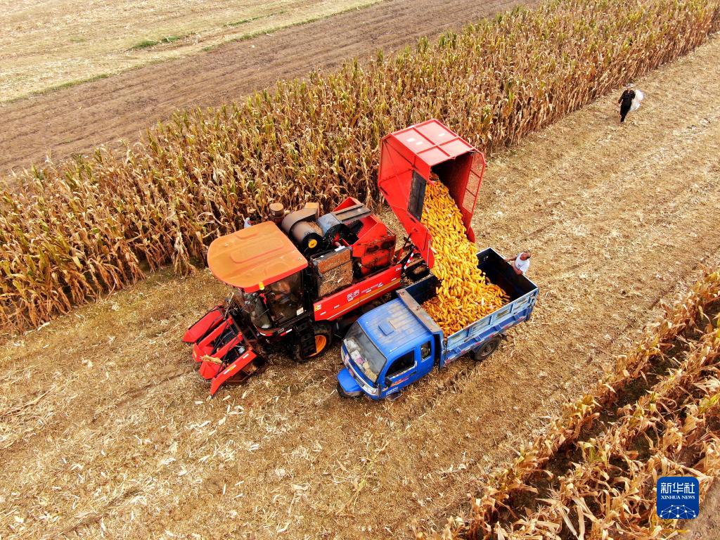 9月18日,在山東省臨沂市平邑縣卞橋鎮新橋村高標準農田里,農機手將收割的玉米裝車(chē)(無(wú)人機照片)。
