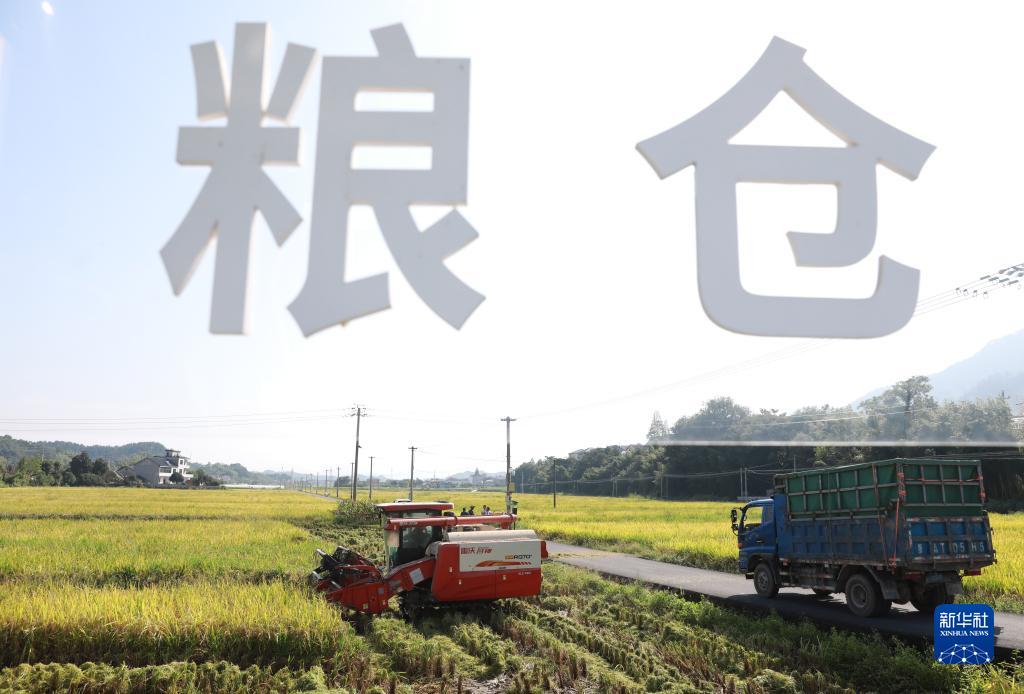 9月18日,在浙江省杭州市臨安區天目山鎮“天目糧倉”糧食功能區,收割機在田間進(jìn)行割稻作業(yè)。