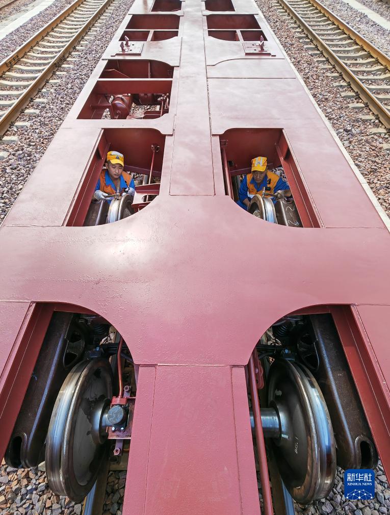 9月17日,在鄭州北站編組場(chǎng),中歐班列(鄭州)整備班組的貨車(chē)檢車(chē)員在檢查車(chē)輛輪對技術(shù)狀態(tài)。