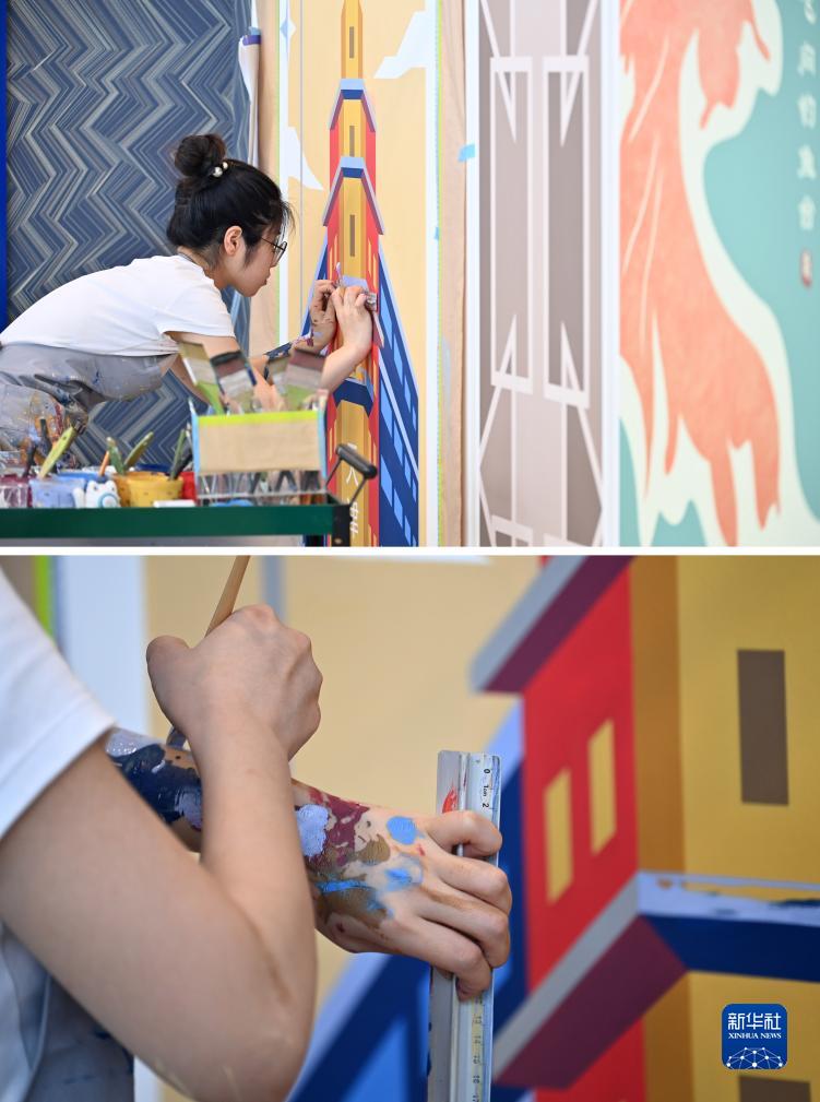 9月18日,選手在國家會(huì )展中心(天津)參加油漆與裝飾項目的比賽(拼版照片)。