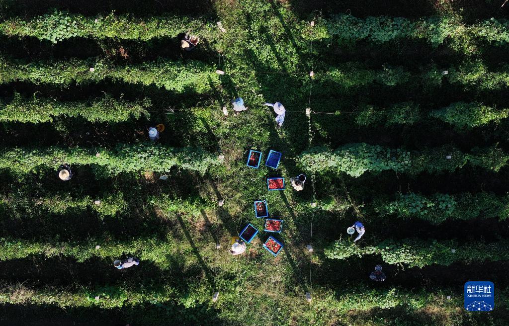9月18日,唐山市豐潤區火石營(yíng)鎮東高莊村的農民采摘五味子(無(wú)人機照片)。