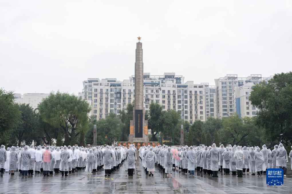 9月18日,在哈爾濱市道外區長(cháng)青公園,人們在東北抗日暨愛(ài)國自衛戰爭烈士紀念塔前手持菊花肅立。