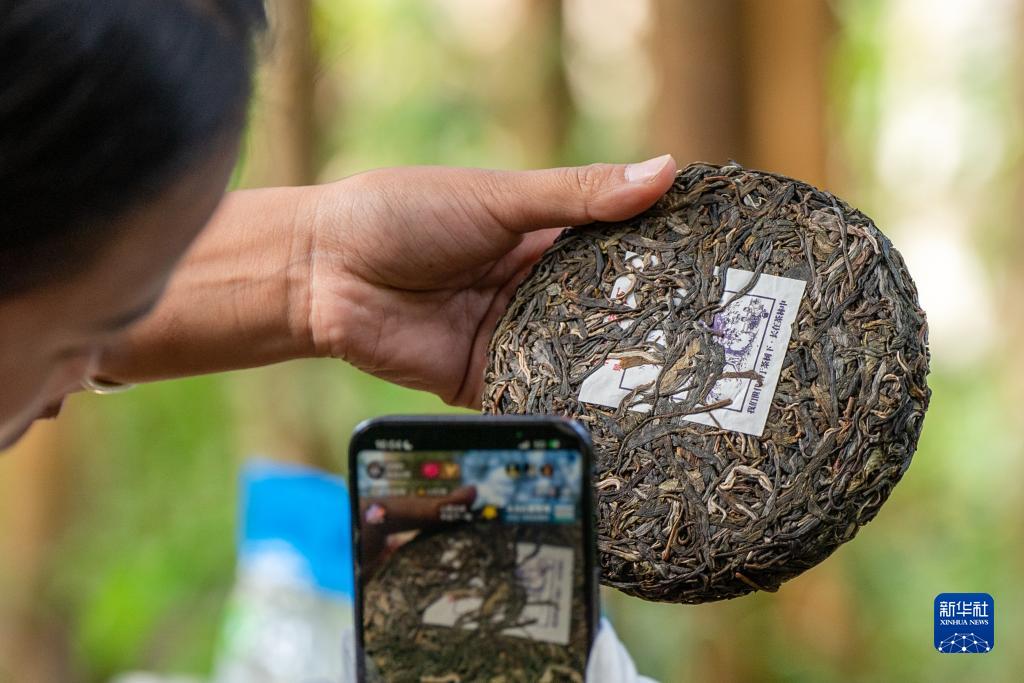 傣族姑娘仙金在景邁山大平掌古茶林中直播推介自家普洱茶餅(9月14日攝)。