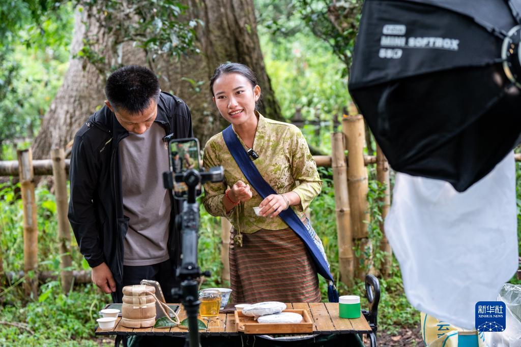 在景邁山大平掌古茶林,傣族姑娘仙金(右)在直播售賣(mài)普洱茶(9月17日攝)。