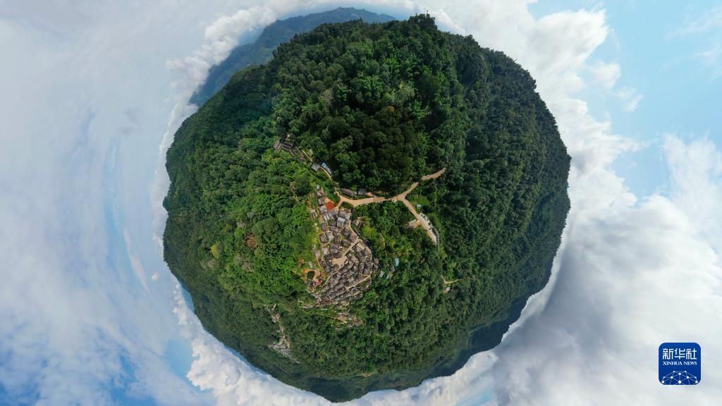 被山林與茶園環(huán)繞的景邁山糯崗古寨一景(無(wú)人機全景照片,9月14日攝)。