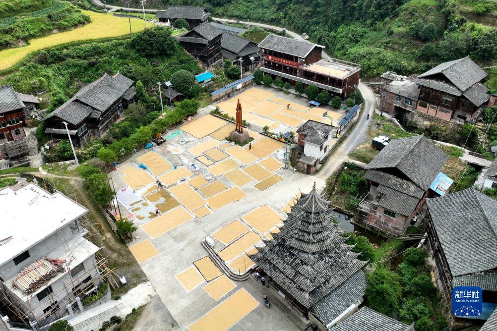 9月18日,在湖南省懷化市通道縣坪坦鄉下盤(pán)古侗寨,村民在鼓樓邊晾曬稻谷(無(wú)人機照片)。
