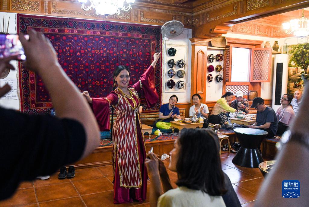 在新疆喀什古城百年老茶館內,人們隨音樂(lè )起舞(9月15日攝)。