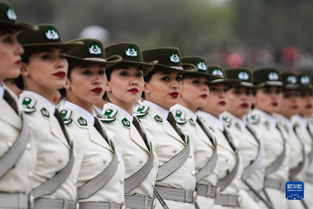9月19日,在智利首都圣地亞哥,女憲兵在閱兵式上列隊行進(jìn)。