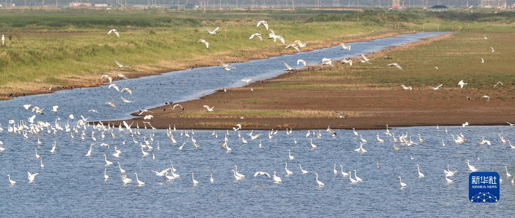 群鳥(niǎo)翔集在東臺條子泥濕地(8月20日攝)。