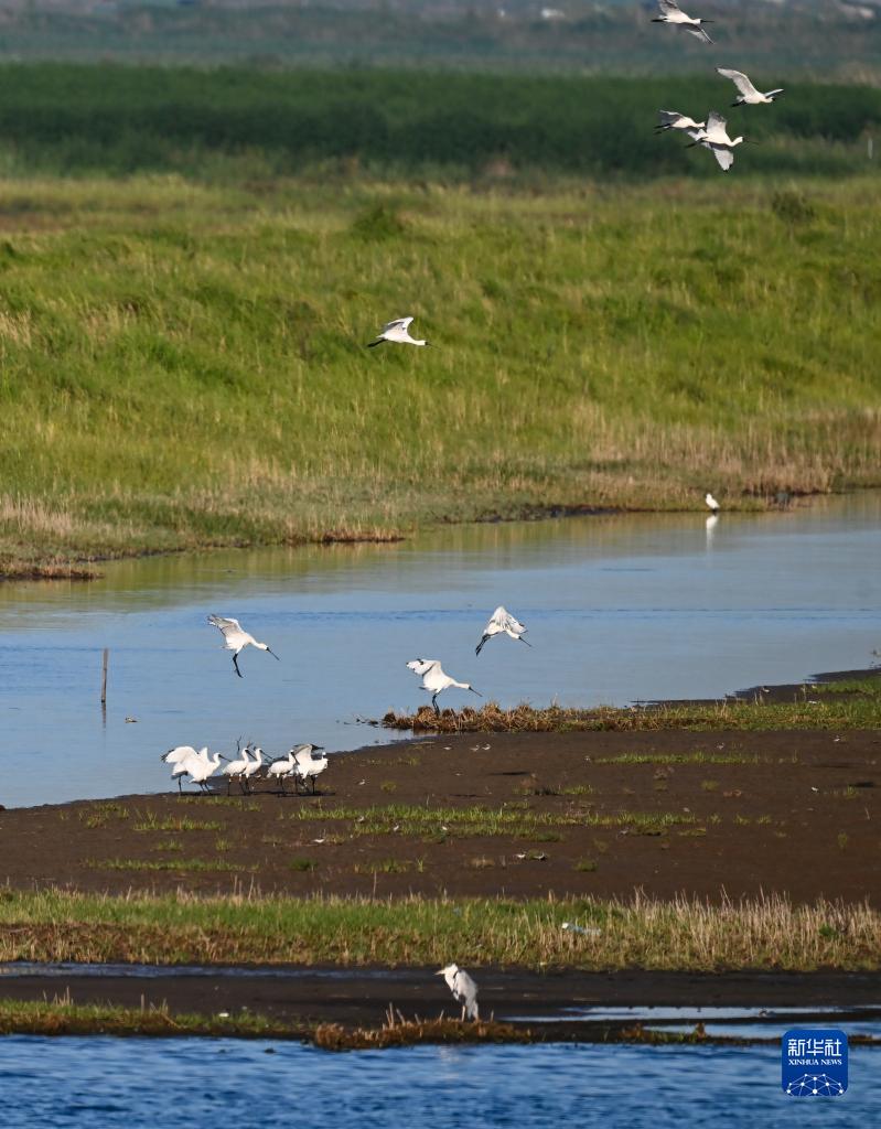 黑臉琵鷺生活在鹽城東臺條子泥濕地(2023年9月1日攝)。