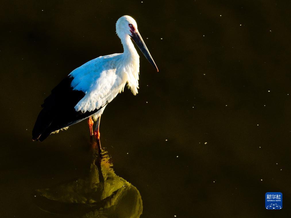 在東臺條子泥濕地拍攝的東方白鸛(9月1日攝,無(wú)人機照片)。