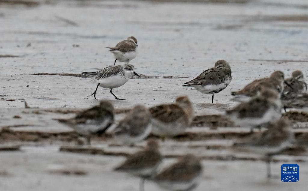勺嘴鷸(上中)在東臺條子泥濕地的灘涂上覓食(8月31日攝)。