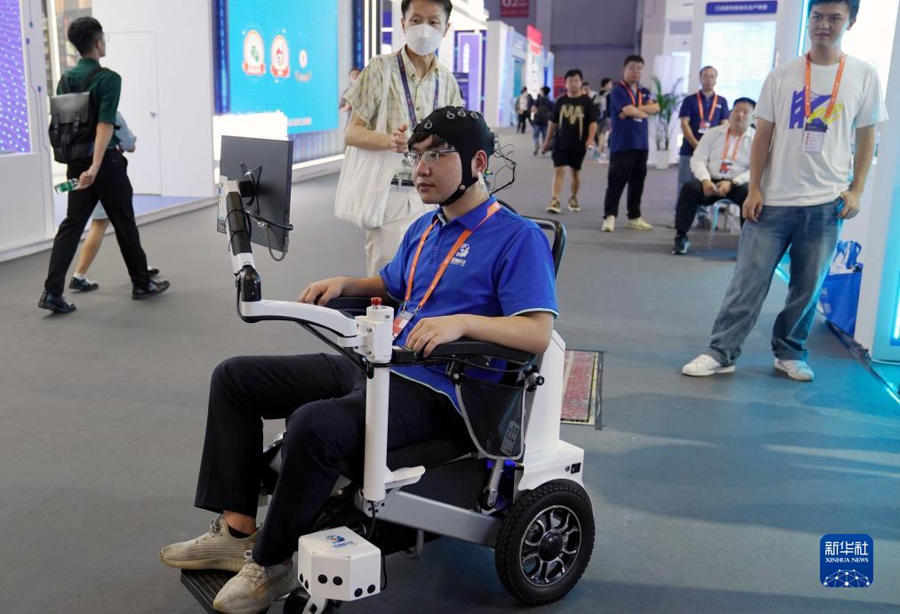 9月20日,上海大學(xué)的展臺工作人員展示腦控康復輪椅項目。