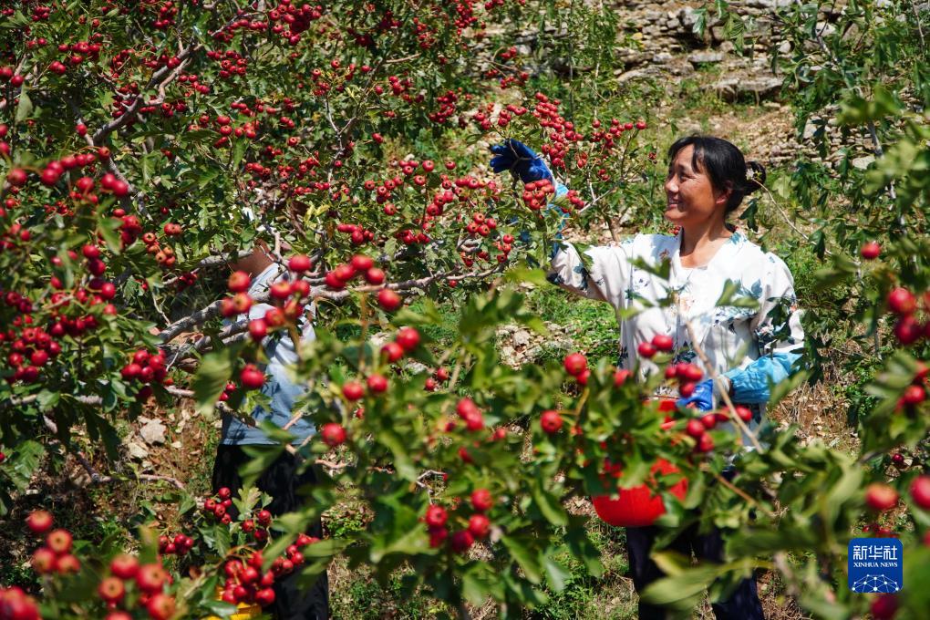 9月20日,在山東省新泰市劉杜鎮,果農在采摘成熟的山楂。