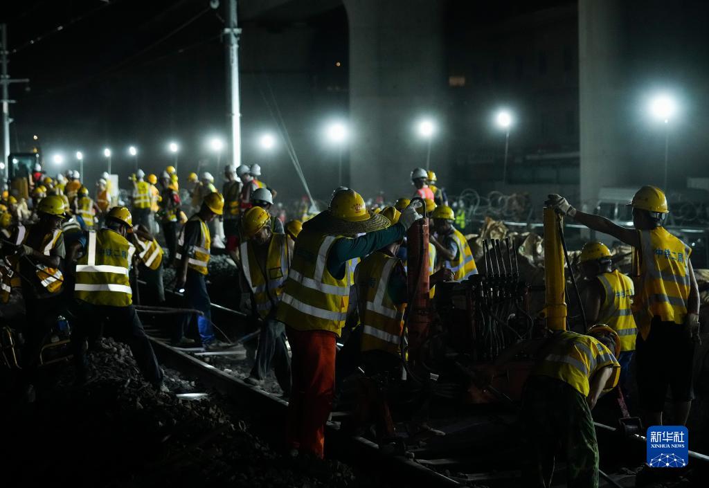 9月19日夜晚,施工人員在滬昆鐵路上海七寶至春申段線(xiàn)路上作業(yè)。
