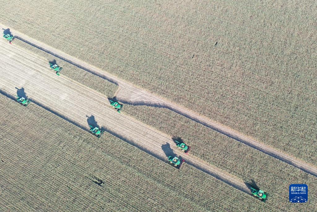 這是9月20日在北大荒農業(yè)股份有限公司友誼分公司一玉米種植地塊拍攝的秋收現場(chǎng)(無(wú)人機照片)。