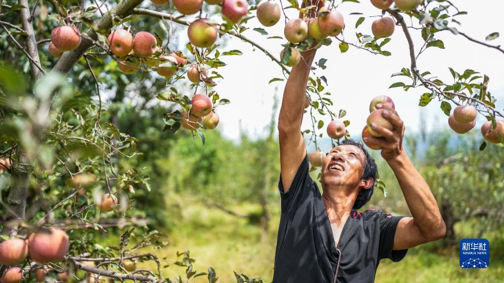 威寧彝族回族苗族自治縣雪山鎮謝家村村民在采收蘋(píng)果(9月20日攝)。