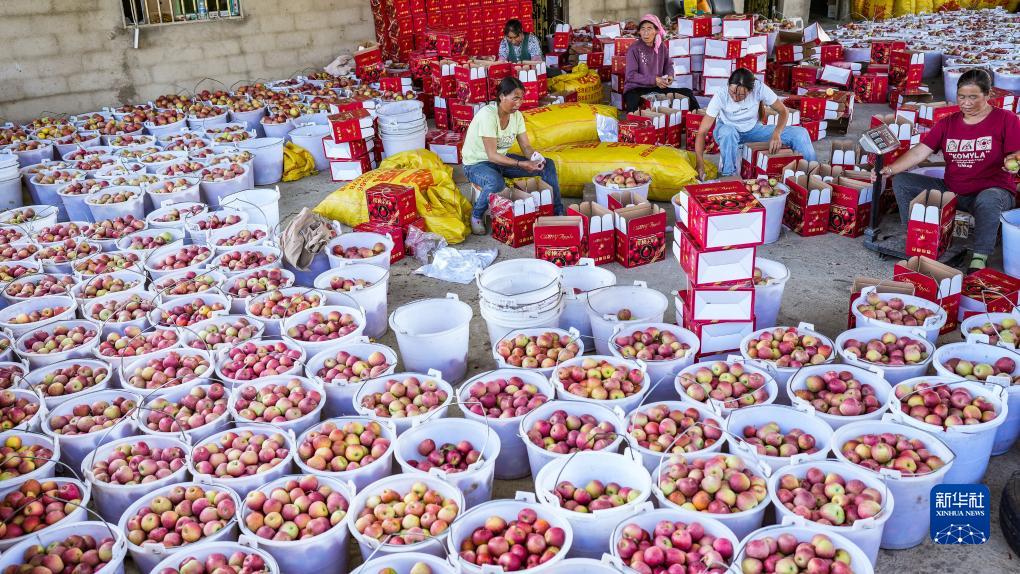 威寧彝族回族苗族自治縣雪山鎮謝家村村民將蘋(píng)果分揀裝箱(9月20日攝)。
