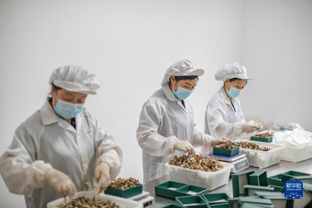 9月20日,在重慶市城口縣嶸彬農業(yè)開(kāi)發(fā)有限公司,工人將風(fēng)干后的食用菌稱(chēng)重裝袋。