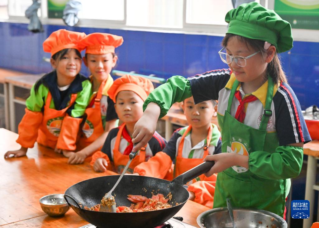 9月20日,重慶市忠縣烏楊小學(xué)廚藝社團的學(xué)生在學(xué)習、體驗炒菜。