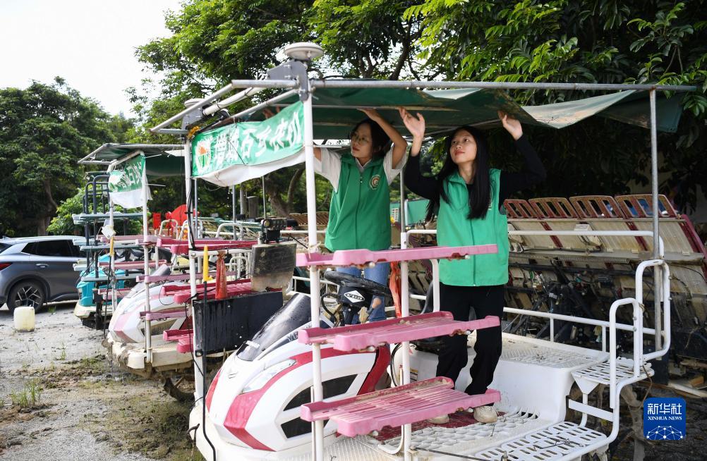 9月18日,在廣州市增城區石灘鎮石湖村的石鄉農機專(zhuān)業(yè)合作社,連日大雨后,沈燕芬(左)和沈笑芬清理農機遮陽(yáng)棚。