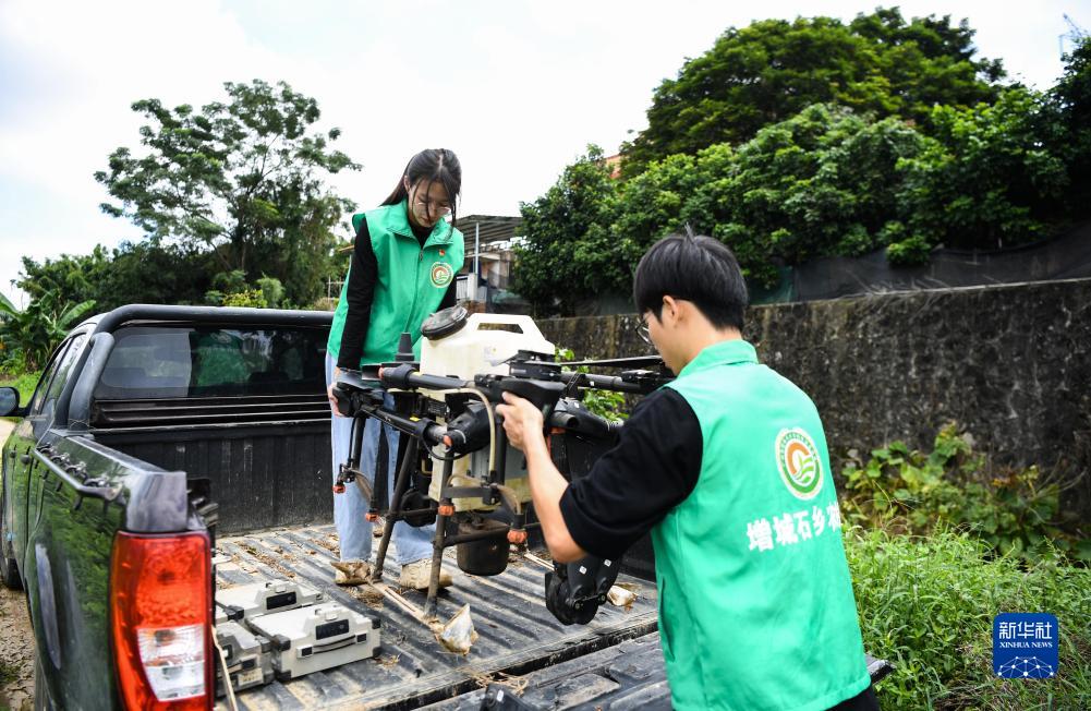 9月13日,位于廣州市增城區石灘鎮石湖村的一處機耕路上,沈笑芬(左)從車(chē)上搬下農用無(wú)人機。