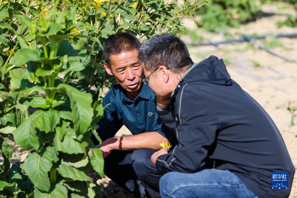 來(lái)自福建省南平市光澤縣農業(yè)農村局的援疆干部呂軍(右)與新疆木壘生福生態(tài)農業(yè)發(fā)展有限公司負責人閆生福交流試種的大葉蛋白菊生長(cháng)情況(9月20日攝)。