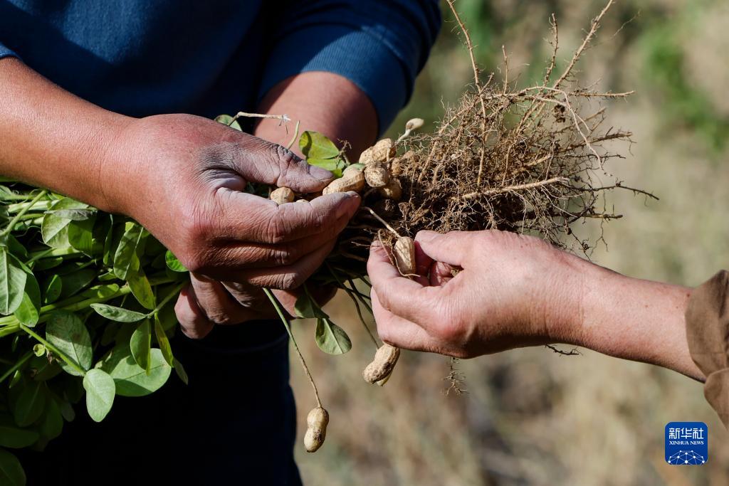來(lái)自福建省南平市光澤縣農業(yè)農村局的援疆干部呂軍(左)與木壘縣三畦村交流試種的花生生長(cháng)情況(9月20日攝)。