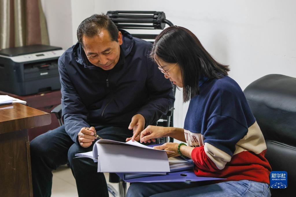 來(lái)自福建省漳州市農業(yè)農村局的黃素英(右)與當地干部交流工作(9月20日攝)。
