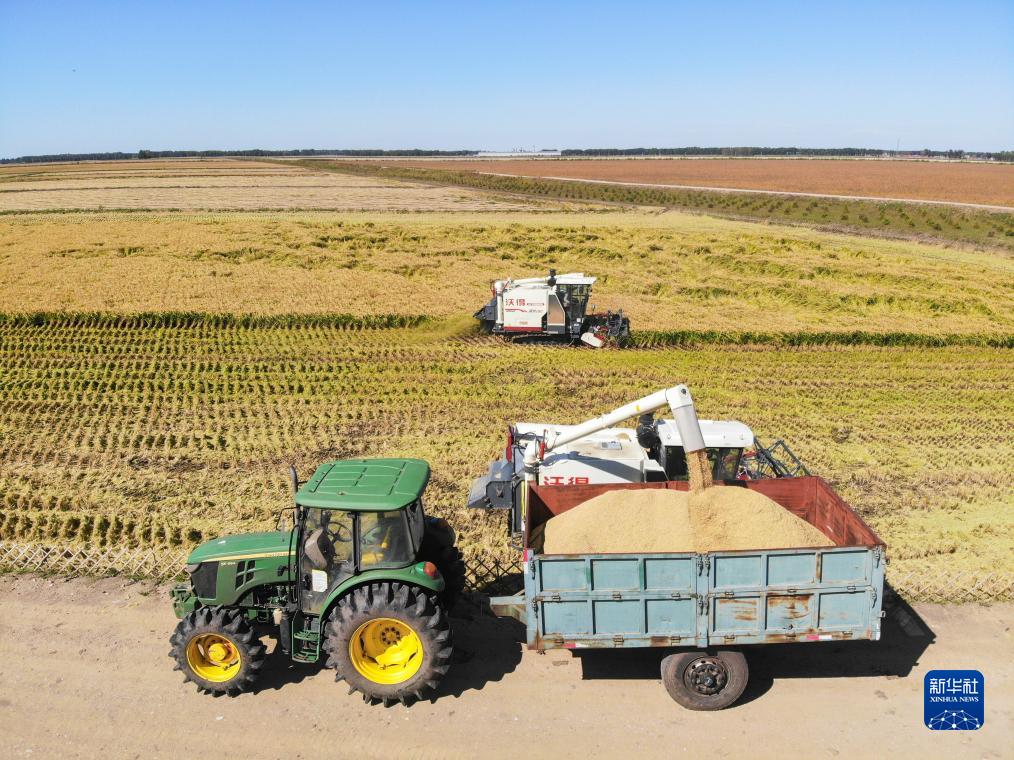 這是9月21日在位于雙鴨山市友誼縣的北大荒農業(yè)股份有限公司友誼分公司一地塊拍攝的水稻收獲現場(chǎng)(無(wú)人機照片)。
