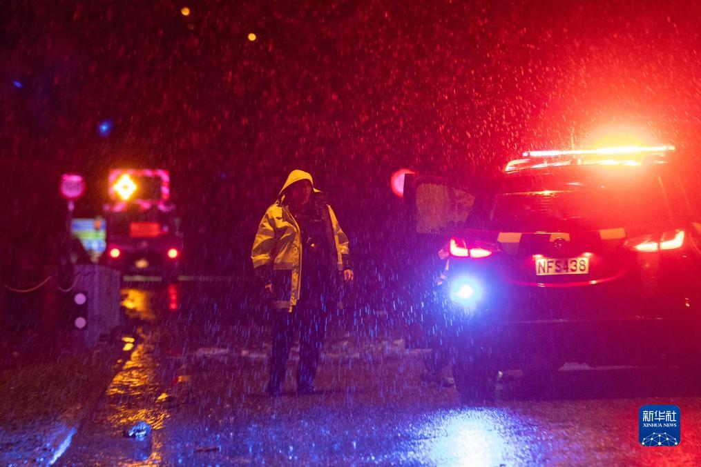 9月21日晚,在新西蘭南島昆斯敦,工作人員在大雨中封閉道路。