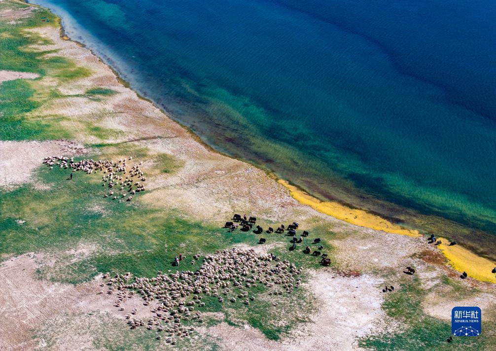牧民在班公湖畔放牧(無(wú)人機照片,9月21日攝)。
