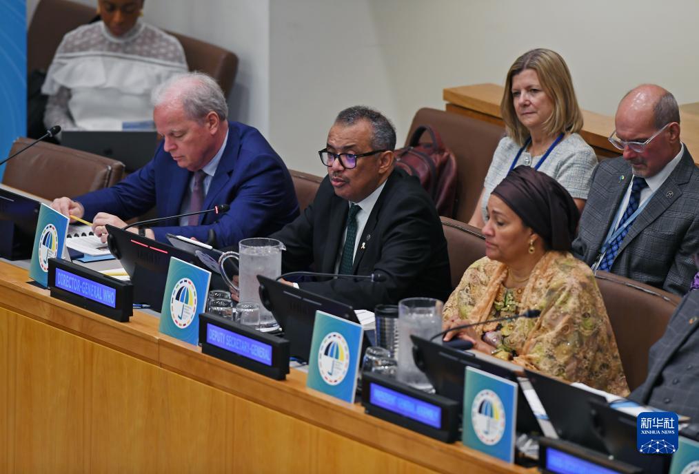 9月21日,在位于紐約的聯(lián)合國總部,世界衛生組織總干事譚德塞(前排中)在第二次聯(lián)合國全民健康覆蓋問(wèn)題高級別會(huì )議上講話(huà)。