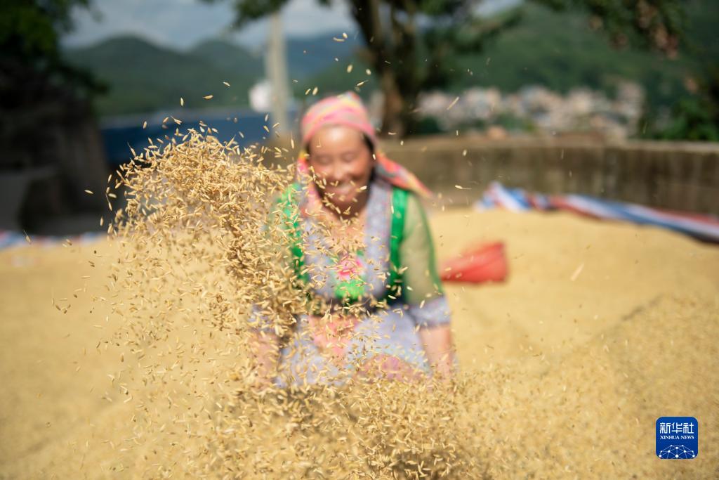 9月10日,云南省文山壯族苗族自治州文山市莫哈紀村村民在翻曬稻谷。