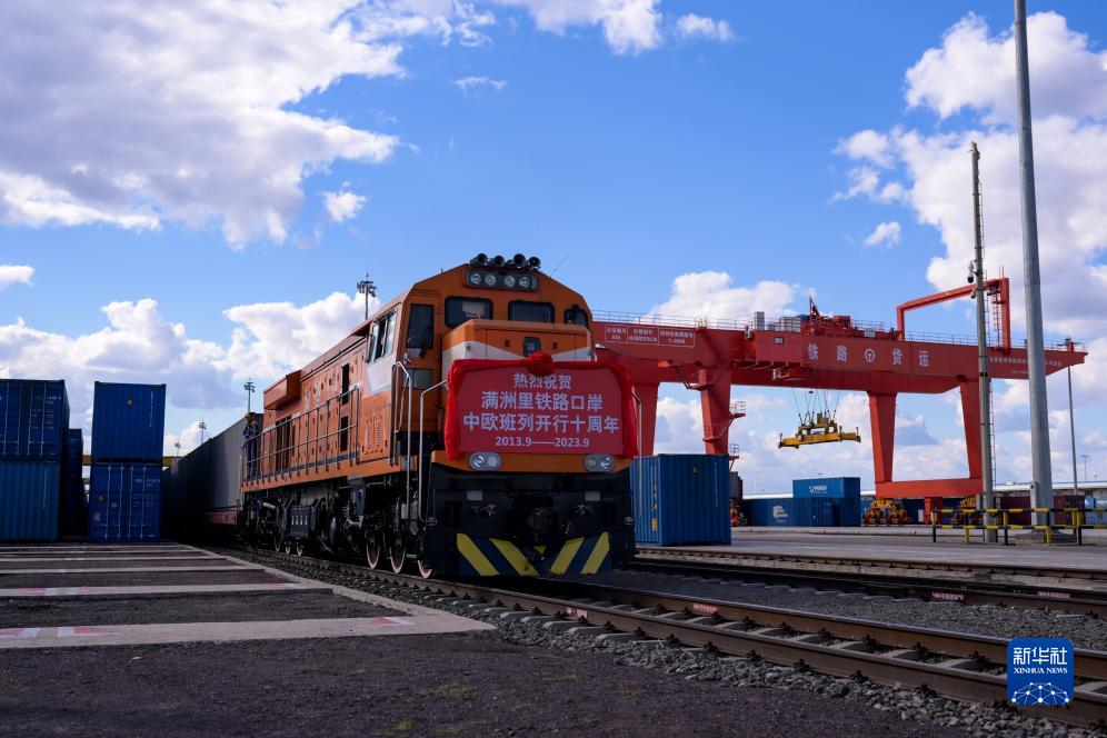9月20日,一列中歐班列行駛在滿(mǎn)洲里站貨運車(chē)間集裝箱場(chǎng)。