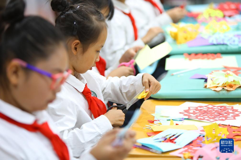 9月22日,孩子們在老師的帶領(lǐng)下創(chuàng )作豐收節的主題剪紙作品。
