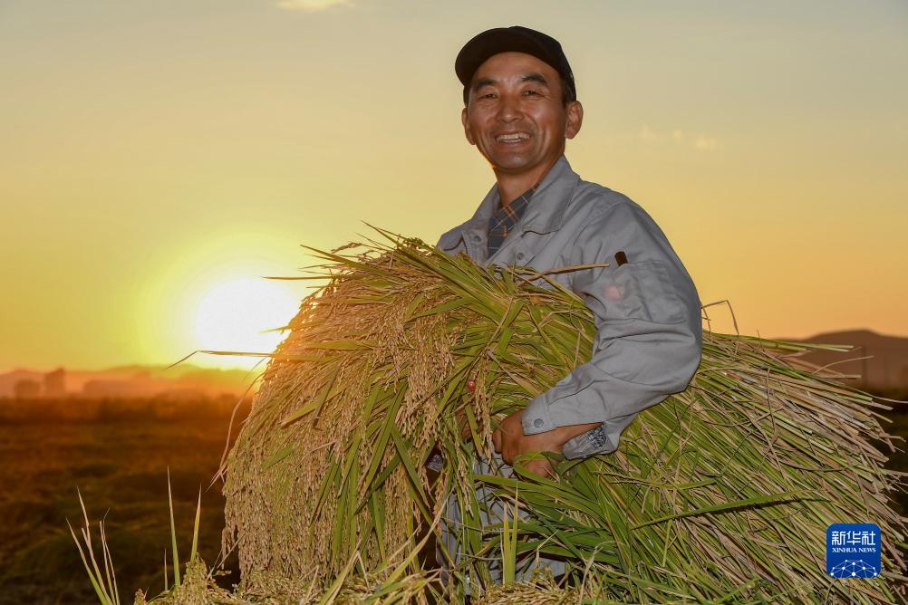 9月21日,在吉林省舒蘭市平安鎮金星村,學(xué)明水稻種植家庭農場(chǎng)負責人李學(xué)明手捧一捆收獲的水稻。